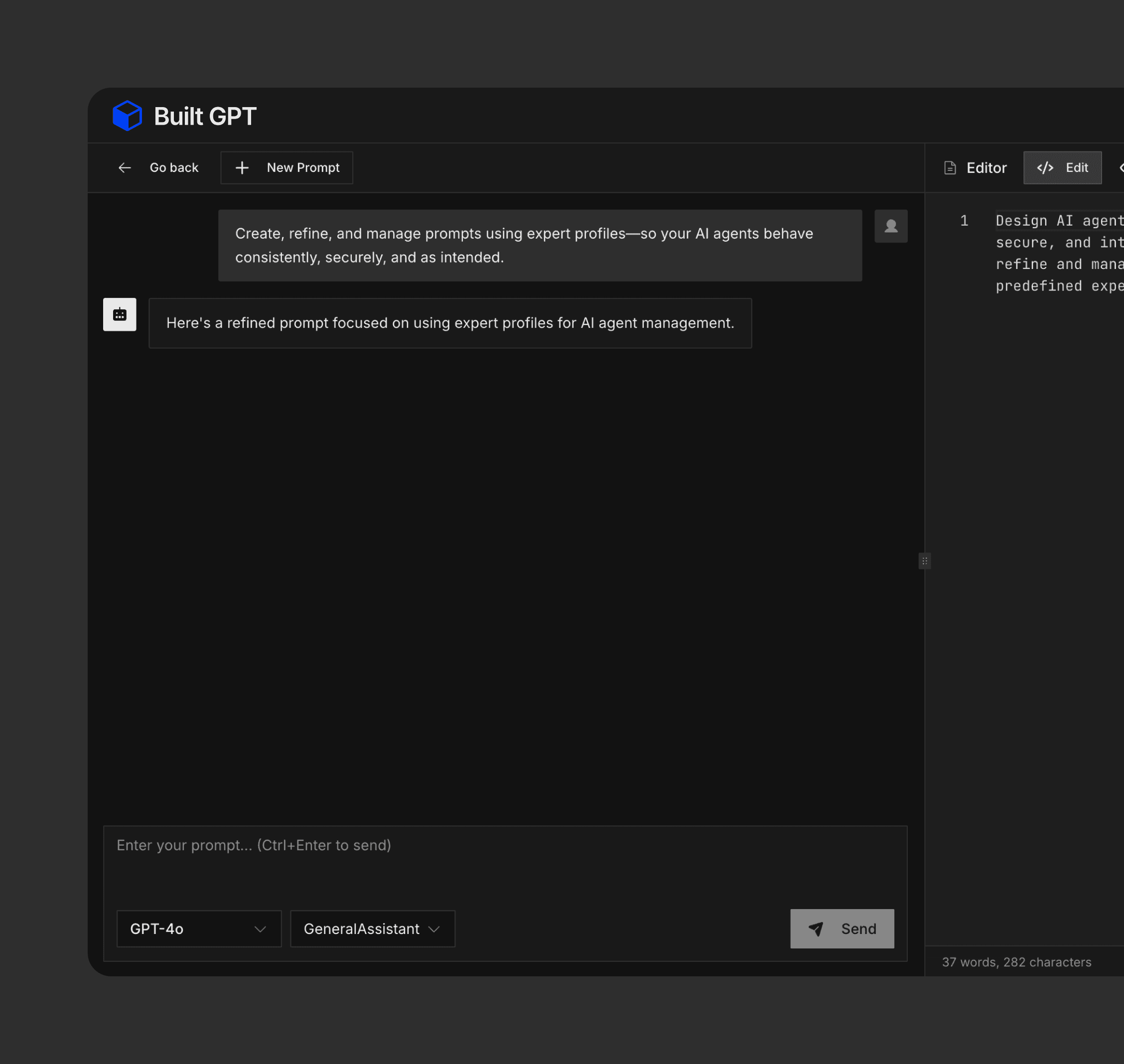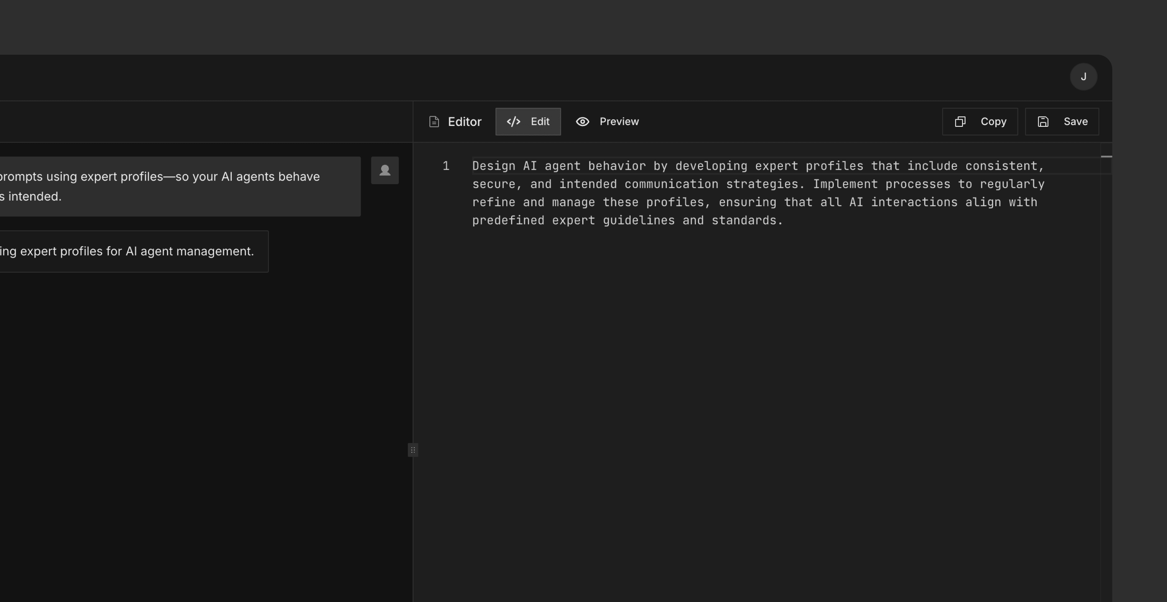 A dedicated workspace to edit and preview the prompt generated by the LLM before using it in an agent or system.
